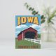 Celebrate the heartland with this charming, vintage-style travel postcard for Iowa! The design features a classic red covered bridge—a quintessential symbol of Iowa's rural landscape and history—set against a bright blue sky and lush green fields. The bold, collegiate-style "IOWA" text and "HAWKEYE STATE" nickname give it an authentic, retro travel poster feel, reminiscent of WPA-era art. This postcard is perfect for sending greetings from the Midwest, collecting as a state souvenir, or framing as unique countryside wall art for anyone who loves farming, Americana, or classic American scenery.