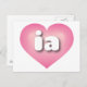 This postcard features a shapely and cool pink heart with a white-washed centre containing the bold, white, rounded lower case letters ia, a playful abbreviation for Iowa, the hawkeye state. The reverse side of the postcard is blank, awaiting your handwritten sentiments or customised text.