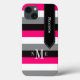 This personalised black, white, grey, and hot fuchsia pink Case-Mate Barely There iPad mini Retina display case has a wide bold striped background pattern and a black banner ribbon with white stitching that you can add your name, initials, monogram or other text to. This modern and trendy new case makes a chic statement for the hip young fashionista! If you need assistance, email niteowlstudio@gmail.com.