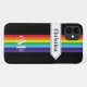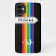 This personalised Case-Mate custom iPhone 11 case has a rainbow-coloured vertical stripes pattern down the centre with a white banner ribbon running horizontally below the camera that has white stitching and white lettering that you can customise with your name or other text. There is also a 3-letter monogram centred at the bottom. The black background can be changed to be any colour you want. You'll be proud to show off this modern and trendy new case that makes a chic statement! If you need assistance, email niteowlstudio@gmail.com.