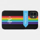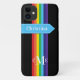 This personalised Case-Mate custom iPhone 11 case has a rainbow-coloured vertical stripes pattern down the centre with a blue banner ribbon running horizontally below the camera that has white stitching and white lettering that you can customise with your name or other text. There is also a 3-letter monogram centred at the bottom. The black background can be changed to be any colour you want. You'll be proud to show off this modern and trendy new case that makes a chic statement! If you need assistance, email niteowlstudio@gmail.com.
