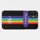 This personalised Case-Mate custom iPhone 11 case has a rainbow-coloured vertical stripes pattern down the centre with a violet purple banner ribbon running horizontally below the camera that has white stitching and white lettering that you can customise with your name or other text. There is also a 3-letter monogram centred at the bottom. The black background can be changed to be any colour you want. You'll be proud to show off this modern and trendy new case that makes a chic statement! If you need assistance, email niteowlstudio@gmail.com.
