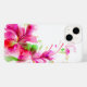 iPhone 14 case is shown with a pretty pink tropical floral design print.