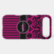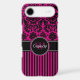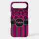 This personalised hot pink and black Case-Mate custom iPhone 6 Plus case has a damask and striped background pattern with a black and white band and circle for add your name, initials, monogram or other text to. This modern and trendy new case makes a chic statement for the hip young fashionista! If you need assistance, email niteowlstudio@gmail.com.