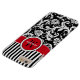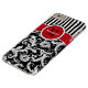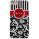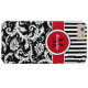 This personalised black and white Case-Mate custom iPhone 6 Plus case has a floral damask and striped background pattern with a red and white band and circle to add your name, initials, monogram or other text to. This modern and trendy new case makes a chic statement for the hip young fashionista! If you need assistance, email niteowlstudio@gmail.com.