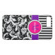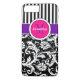 This personalised black and white Case-Mate custom iPhone 7 case has a floral damask and striped background pattern with a hot pink, purple and white band and circle to add your name, initials, monogram or other text to. This modern and trendy new case makes a chic statement for the hip young fashionista! If you need assistance, email niteowlstudio@gmail.com.