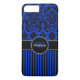 This personalised royal blue and black Case-Mate custom iPhone 7 case has a damask and striped background pattern with a black and white band and circle to add your name, initials, monogram or other text to. This modern and trendy new case makes a chic statement for the hip young fashionista! If you need assistance, email niteowlstudio@gmail.com.