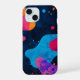 A dynamic and modern abstract background featuring a dark blue, almost black, backdrop contrasted with vibrant, fluid shapes in neon orange, bright pink, electric blue, and purple. The design has a chaotic yet balanced composition with splatters, dots, and large amorphous blobs that appear to be floating or colliding. The texture gives it a grunge or painted feel, resembling a colourful cosmic explosion or ink blobs in water. This is a bold and energetic wallpaper ideal for digital devices.