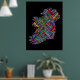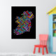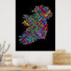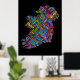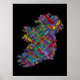A typography text map of Ireland featuring over 590 cities and towns within Ireland. Multi-coloured text on a black background.