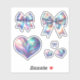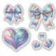 This elegant vinyl sticker set showcases iridescent bows and hearts in various sizes with shimmering rainbow colours and luminous qualities. The stylish, bow-themed and heart motif sticker will add a touch of flair to anything you add them too.
