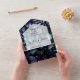 This design is for those who love some bling and nature. They are beautiful, lush tapestry of iridescent crystals, pearls, metals, diamonds, opals, and other gemstones in a natural organic pattern. I designed the all-in-one invitations to be used in conjunction with return labels for the RSVP portion.