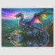Beautiful and colourful Iridescent Dragon with wings wide spread stands on a mountain