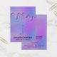 The background of our iridescent foil earring display blends shades of pink, purple and blue in an artistic abstract pattern... perfect for creatives who design jewellery as their business or side hustle. Holographic metallic drips taken from the same pattern have an embossed look as they border the top of the card. The embossing is a graphic technique that is printed on the paper, rather than being an actual physical element overlaid on the card. On front of the card are two printed circles to guide your punching of the holes for the earrings and, below that, your business name and boutique services. All text on front and back of this jewellery display card can be easily and quickly revised on the personalisation template.