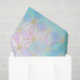 Geometric cube shapes are layered in a pattern and coloured in alternating shades of pastel blue, pink and purple that gives it an iridescent glass look. The shapes are outlined in faux gold glitter.