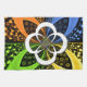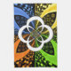 Orange, Blue, Green, Yellow: These bright and saturated colours fill the four petals, providing strong contrast and creating a visually striking effect against the darker background.