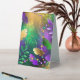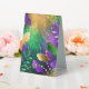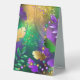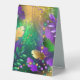 Textural iridescent mardi gras background with spots of purple, yellow and green, decorated with fluffy feathers and shiny beads. Mardi gras holiday.