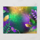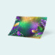 Textural iridescent mardi gras background with spots of purple, yellow and green, decorated with fluffy feathers and shiny beads. Mardi gras holiday.