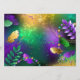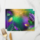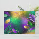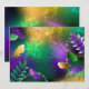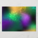 Textural iridescent mardi gras background with spots of purple, yellow and green, decorated with fluffy feathers and shiny beads. Mardi gras holiday.