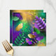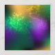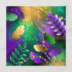 Textural iridescent mardi gras background with spots of purple, yellow and green, decorated with fluffy feathers and shiny beads. Mardi gras holiday.