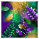 Textural iridescent mardi gras background with spots of purple, yellow and green, decorated with fluffy feathers and shiny beads. Mardi gras holiday.