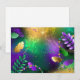 Textural iridescent mardi gras background with spots of purple, yellow and green, decorated with fluffy feathers and shiny beads. Mardi gras holiday.