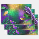 Textural iridescent mardi gras background with spots of purple, yellow and green, decorated with fluffy feathers and shiny beads. Mardi gras holiday.