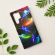 Shimmering fractal wings ripple across a deep obsidian canvas, glowing in neon blues, magentas, and gold. Inspired by the fluid motion of butterfly flight, this digital art design transforms your phone into a luminous, modern statement piece.