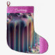 Picture a delightful Christmas stocking featuring an iridescent rainbow design dripping with elegance. The stocking is finished with a border that mimics sparkling glitter in a rich hot pink, providing a lovely contrast. On the topper and the toe of the stocking ready to be personalised with a name.