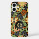 Stylised iris flowers and fiddlehead ferns in a colourful floral design over a black background with a personalised monogram in colours to match the pattern.