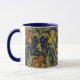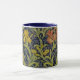 This design features a print of a fabric design created by the British artist William Morris (1834–1896), who is associated with the Arts and Crafts Movement. It depicts blue and orange iris flowers in an elegantly symmetrical pattern. The flower is named after Iris, who was the Greek goddess of the rainbow and a messenger for the Olympian gods, carrying messages down to humanity. The leaves and stems of the iris plants are depicted in blue and green. There are a few yellow birds perching on some of the plants' foliage. The original pattern was designed by William Morris in 1887.