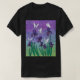 It's summer. The irises are in bloom. Irises are blossoming on long sturdy sinuous stems. Their petals are a wash of variegated purple: violet and plum. Their stems are saturated sage green. The summer sky is a striated wash of colour: lilac purple, violet, periwinkle, aqua blue, and spring green. Several stylised butterflies flutter above the flowers. Their wings are yellow, white, and blue. It's a whimsical summery illustration, perfect for anyone who loves irises.
