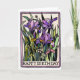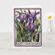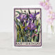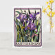 A bouquet of wild irises and other spring wildflowers, carved and printed from a linoleum block and hand coloured with watercolors, is a good way to say Happy Birthday. Shades of purple and green make this fresh choice.