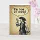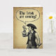 This card shows a sepia-and-cream scene styled like an old printed notice, with deep black ink lines and heavy cross‑hatching for texture. A man in 18th‑century dress stands along the lower part of the design, wearing a tricorn hat, a ruffled shirt, and a fitted waistcoat. Shown in profile, he looks upward with wide eyes and an open mouth, as if calling out to someone just beyond the page, and his raised hand with spread fingers adds a dramatic, almost friendly “come closer” motion. Above him, a large speech bubble fills the upper area, edged with a worn texture that matches the aged paper look. Inside the bubble, the words “The Irish are coming!” appear in ornate black lettering, centered and sized to dominate the top half, with a little extra spacing that makes it feel like a headline. The background is a parchment-like field with a faint grid and distressed edges, and small touches of 💚 and ☘️ sit near the corners like tiny festive accents. The overall frame keeps the figure anchored at the bottom while the oversized speech bubble looms overhead against the map-like paper backdrop.