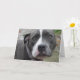 This gorgeous birthday greeting card show a stunning image of a Irish Blue Staffordshire Bull Terrier dog on the front. Inside the birthday card it has in black ink 'Have a very Happy Birthday!' in the centre of it. On the back of the card it has a smaller version of the dog picture which is on the front of the card. This is a beautiful card, ideal for a friend or loved one.