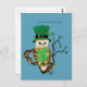 Cute barn owl wearing a green leprechaun top hat with two clovers in it.