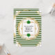 A beautiful design of horizontal forest green and white stripes framed by a faux gold scallop edge on white. There are two green four leaf clovers on the front giving a feel of elegance and style.
