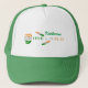 Trucker hat uses an Irish flag in a rose motif. The flower has the green, white, and orange colours in the Irish tricolor. The stem reads IRELAND, also in the tricolor. Add a name in green letters next to the stem. Now you can have your own Irish Rose. Great to wear to a family reunion, travel group, or club.