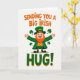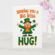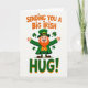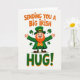 This card features a happy leprechaun standing in the center on a white background, arms open as if leaning in for a friendly hug 💚. He wears emerald green clothing with a tall top hat and a gold buckle, plus a long green coat with patterned trim along the sleeves and hem. A warm orange vest peeks out beneath the coat, echoing the fiery orange of his full beard and eyebrows, and his wide smile feels like an invitation to get close. Deep green shamrocks float around him, scattered like little lucky notes in the open space ☘️. Across the top, the text “SENDING YOU A BIG IRISH” curves in orange, drawing your eye down toward the character’s face and open hands. At the bottom, “HUG!” sits large in green with a thin orange outline, balancing the layout and tying back to the beard and vest. The overall scene stays simple and bright, with the leprechaun centered, shamrocks spaced around him, and the orange-and-green lettering framing the image from top to bottom.