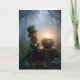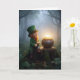 A joyful Irish leprechaun perched on a tree stump, surrounded by a magical, misty forest, proudly guarding a radiant pot filled with shimmering gold coins.