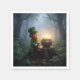 A joyful Irish leprechaun perched on a tree stump, surrounded by a magical, misty forest, proudly guarding a radiant pot filled with shimmering gold coins