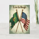 This design shows two crossed flags on shiny gold staffs, leaning toward each other like close friends sharing a quiet moment 💚. The left flag is a deep emerald green with a detailed gold emblem that resembles a Celtic harp, outlined in glowing gold lines. On the right, the American flag appears slightly aged, with softened red stripes and a muted blue canton dotted with pale stars, giving it a gentle, timeworn look. Their poles overlap neatly at the center, and the gold finials catch the light as if they’re being shown off for a special day ☘️. Above the flags, “Erin Go Bragh” sits centered near the top in a serif font, with gold lettering edged by a darker outline for contrast. Behind everything is a pale sage-green background with a lightly mottled texture, like brushed paper with a soft patina. The green banner curves outward on the left while the American flag drapes to the right, both with visible folds and shaded ripples along their edges.
