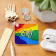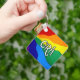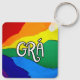 The image features the Irish Language word 'GRÁ', meaning love, in a stylized, white font with a black outline, superimposed over a background of layered, torn paper in rainbow colors. The colors transition from red at the top to orange, yellow, green, blue, and purple at the bottom. The paper edges are rough and uneven, creating a textured effect. The overall mood is vibrant and cheerful, with a focus on color and texture. A great gift for rainbow fans, irish language learners and speakers and keyring collectors!