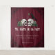 This elegant Irish Til Death Burgundy Gothic Skulls Backdrop features hand-drawn black-ink Irish and gothic illustrations, showcasing two skulls and a black crow surrounded by green roses, leaves, berries, wildflowers, and lucky green clovers. Set against a deep burgundy background, this dramatic design is perfect for gothic weddings, Irish-themed celebrations, and moody event décor. All text is editable for easy personalization.