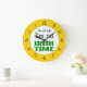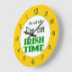 This funny wall clock reads I'm not late, I'm on Irish Time, with Celtic knotwork letters in green, backwards numbers on an orange background.