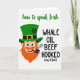 This card features a white background with a friendly leprechaun on the left, smiling wide with bright aqua eyes that seem to linger warmly as if he’s sharing a private joke with you 💚. His fiery orange beard and mustache frame rosy cheeks, and he wears an emerald green top hat with a black band, a gold buckle, and a small dark shamrock detail ☘️. A short dark blue pipe rests near his mouth, sending up a thin curl of grey smoke that drifts upward. On the right, the humor comes through in stacked text that feels like a lighthearted nudge between friends. Near the top, “how to speak Irish” appears in green lettering, centered above the larger phrase below. Under it, “WHALE OIL BEEF HOOKED” is set in black, all caps, taking up the most space, with “(say it fast)” in smaller black text beneath it. The leprechaun’s hat tilts slightly, and the smoke wisp rises in a soft curve beside his face.