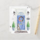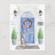 Announce your new address with our stylish announcement featuring a Irish Wolf Hound, blue front door, welcome mat, slate sign, topiaries and a floral wreath set on a grey brick background.