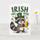 This card features a cheerful cartoon raccoon on a white background, dressed in a green leprechaun hat with a gold buckle and a small clover ☘️. Its striped tail curls behind it, and its big shining eyes and wide grin suggest it’s sharing a friendly, inviting moment with whoever’s looking. The raccoon holds a large mug of golden ale topped with thick foam, angled forward like a toast between close pals 💚. Across the top, the phrase “IRISH YOU WERE” appears in dark green, all-cap letters, centered above the character. Small green shamrocks float around the raccoon, spaced out so the scene feels open and easy to take in. Strong outlines and flat color areas keep the illustration crisp, with the warm gold of the drink standing out against the greens. The hat’s buckle is a bright yellow-gold rectangle, and the shamrocks are scattered in different sizes across the white space.