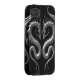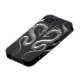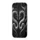 Two silver tribal dragons face each other in this aggressive symmetrical design. The winged serpents have the appearance of being cast out of solid iron which creates a stunning 3D look. The dragons sit on a pure black background creating a striking contrast. The metallic texture and deep silver colour gives this iphone4 case a stylish look.