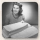 Woman sitting at pile of ironed linen and towels (B&W), portrait | George Marks | AssetID: 72131160