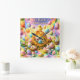 Description brighten every hour with the enchantment of springtime with this hope is ready to hatch square wall clock whimsical timepiece features of fluffy yellow chick perched a top of glowing golden egg surrounded by a vibrant field of decorated Easter eggs and a sweet white bunny set against a dreamy rainbow sky with a cheerful message happy Easter this colourful scene perfectly captures the joy